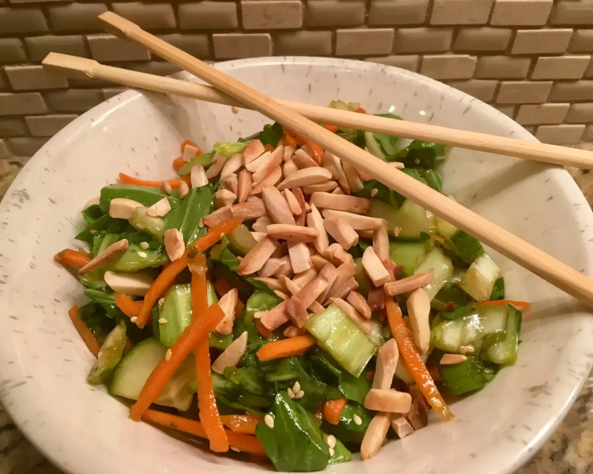 - Add dressing to the salad and toss until combined. Optional – top with extra sesame seeds, almonds, or scallions.